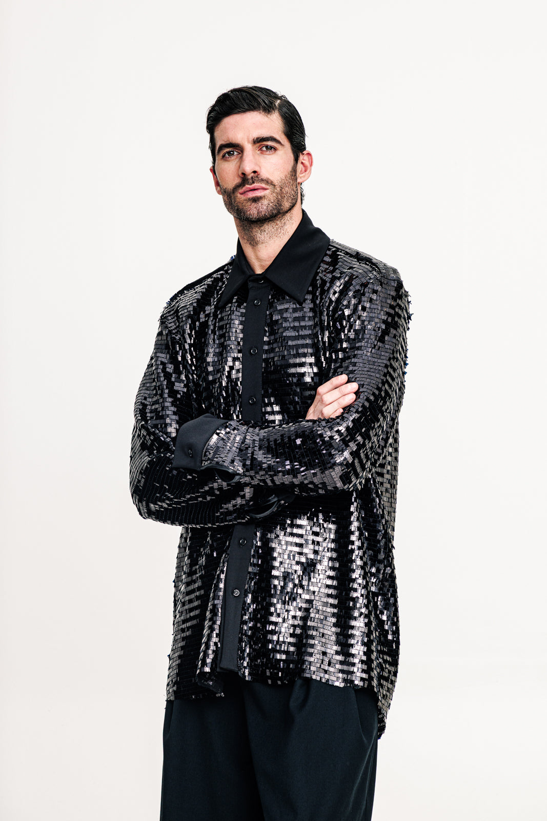 A blcack sequined shirt with a sleek, contemporary silhouette. The shimmering surface catches the light, adding depth and refined glamour. Lightweight and versatile, it transitions effortlessly from day to evening. A statement piece that merges bold character with modern sophistication.