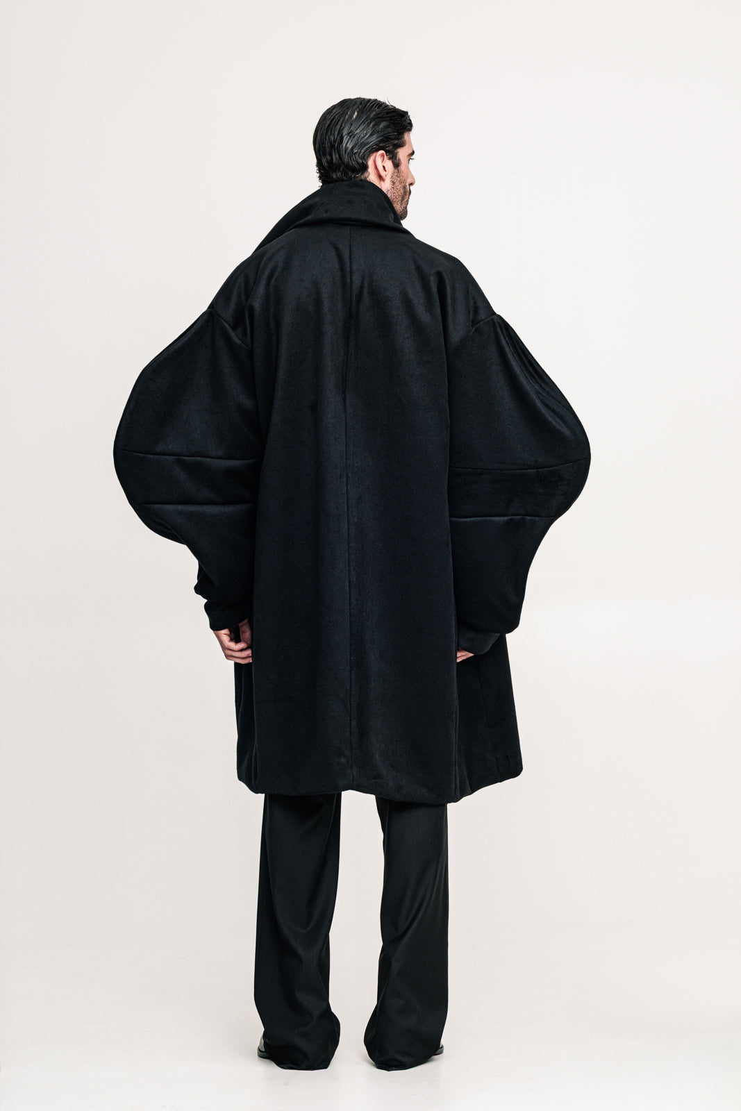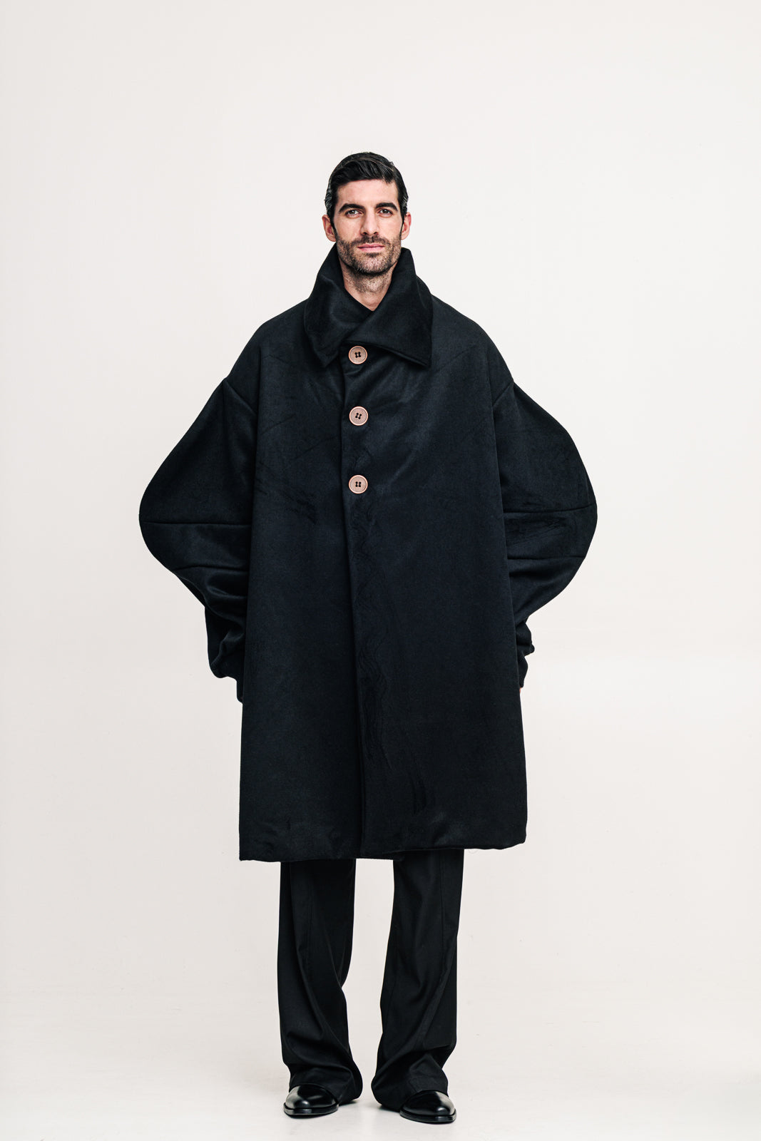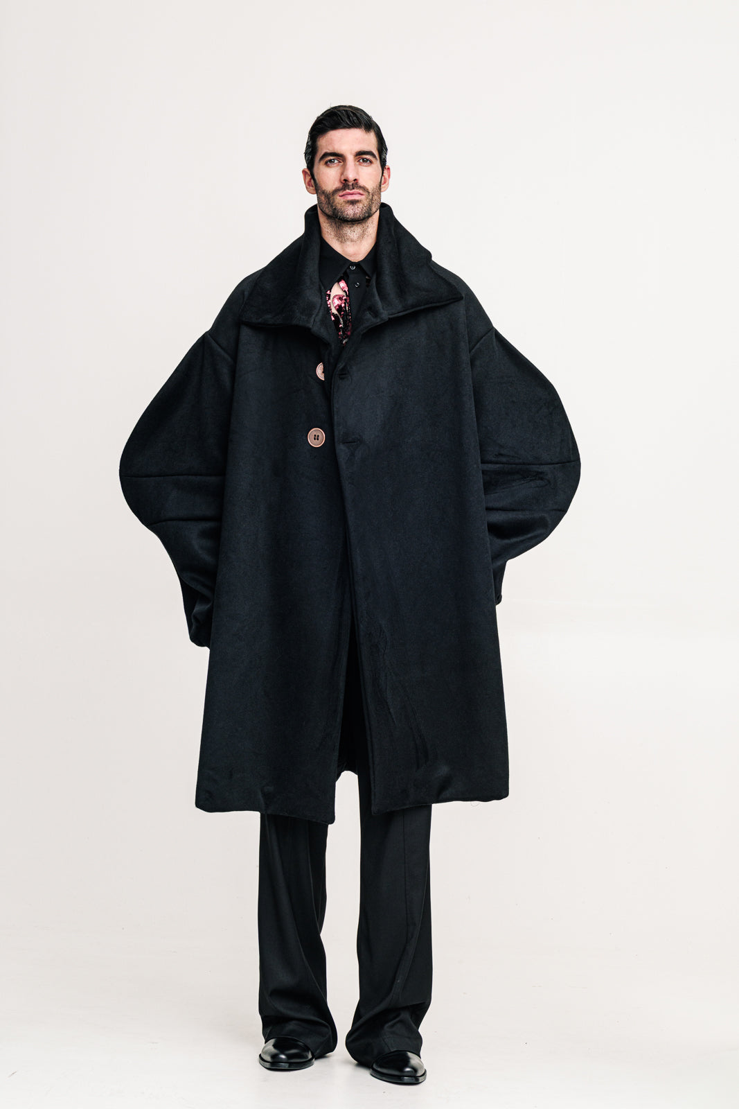 A long overcoat in black with a clean, structured silhouette. Crafted from textured bouclé fabric, it adds depth and refined character. The tailored cut brings sharp elegance while remaining versatile for layering. A timeless outerwear piece that embodies modern sophistication.