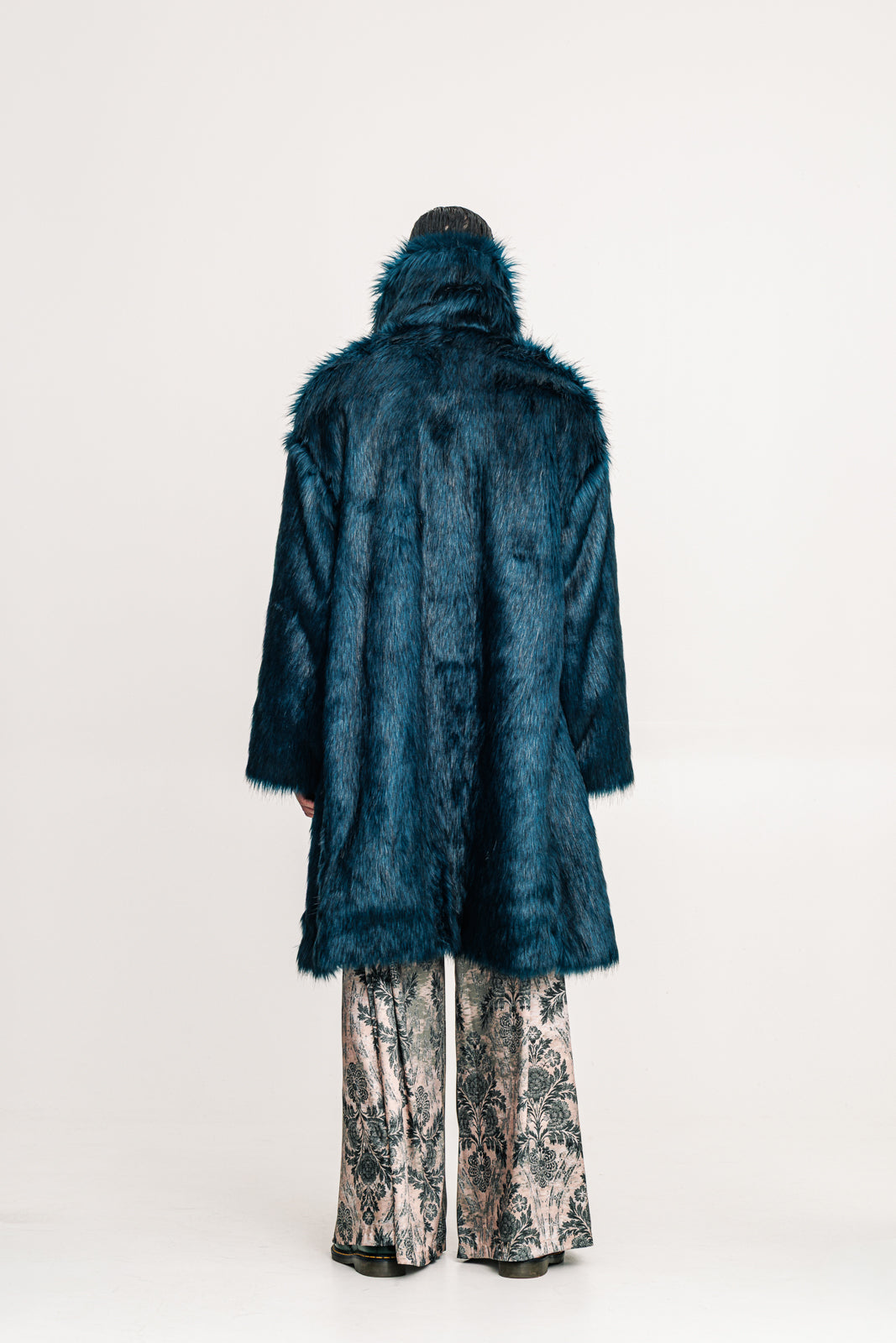 A faux-fur coat in deep petrol with a soft, voluminous silhouette. The plush texture adds warmth while maintaining a refined, modern presence. Designed with minimal detailing, it layers effortlessly over both casual and elevated looks. A statement outerwear piece that blends bold character with understated elegance.