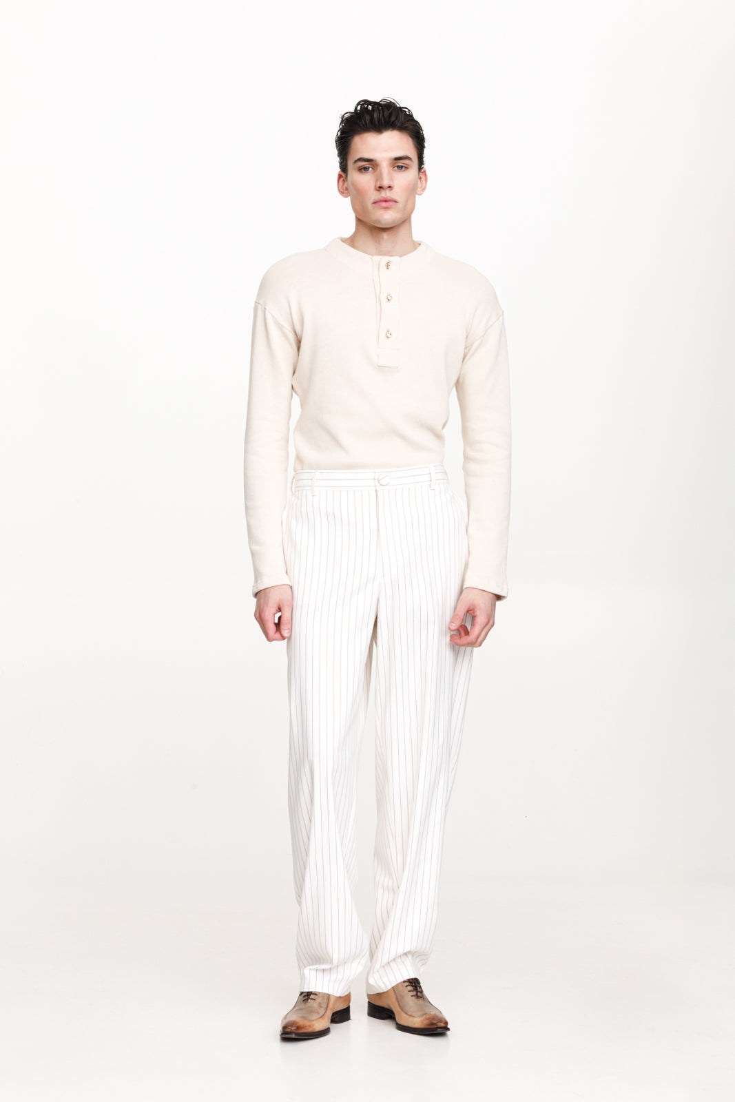 Striped white pants with a clean, elongated silhouette. The subtle pattern adds structure while maintaining effortless elegance. Lightweight and versatile, they move seamlessly between casual and elevated styling. A contemporary piece that balances classic tailoring with modern sophistication.