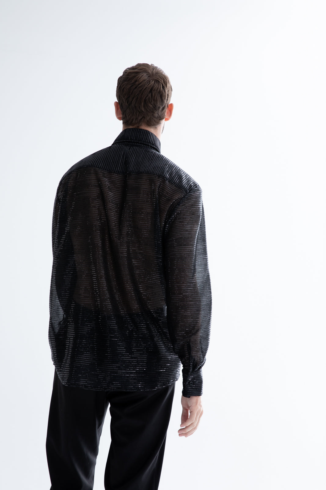 Introducing the "Brillar Shirt" in black color, the epitome of versatile sophistication for all-day wear. This shirt is meticulously designed from shiny detailed fabric, seamlessly blending comfort and elegance. Crafted  with long, oversized sleeves featuring cuffs and a regular collar which maintains a classic look.