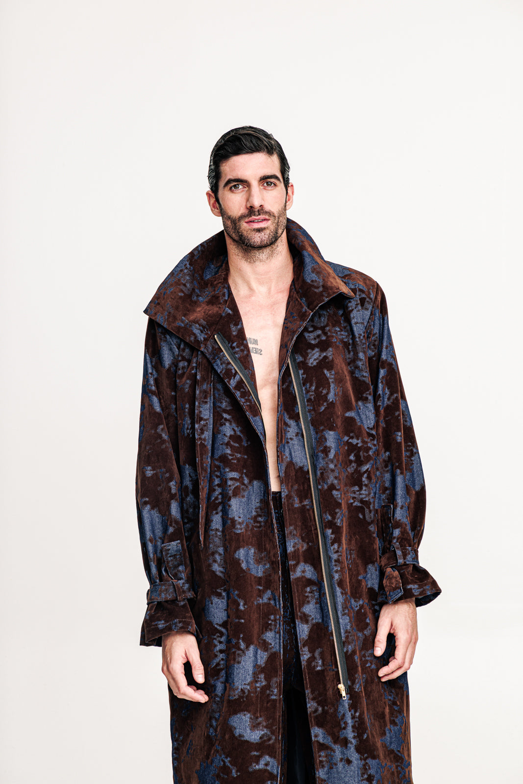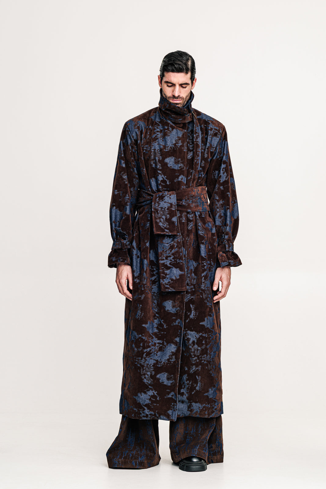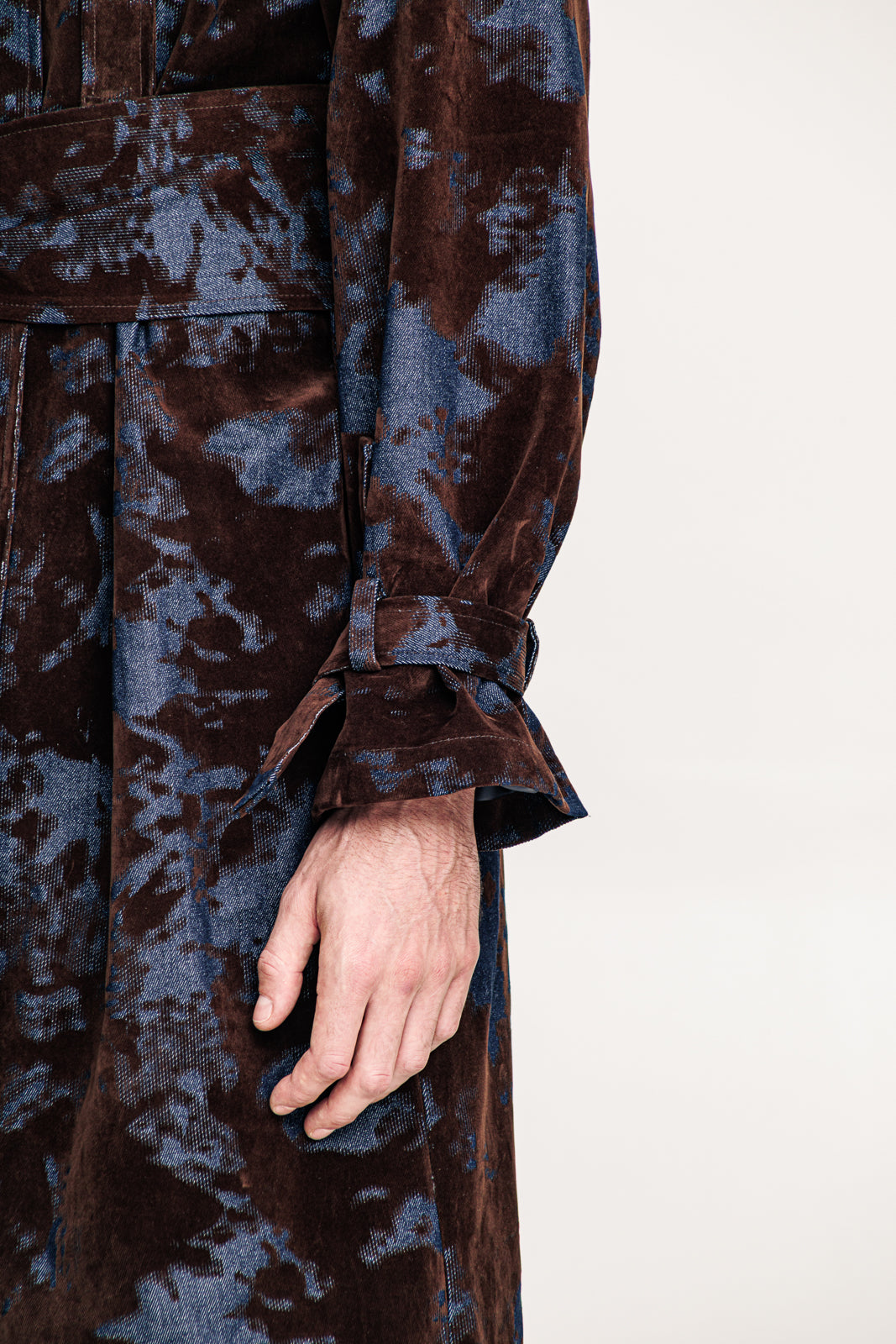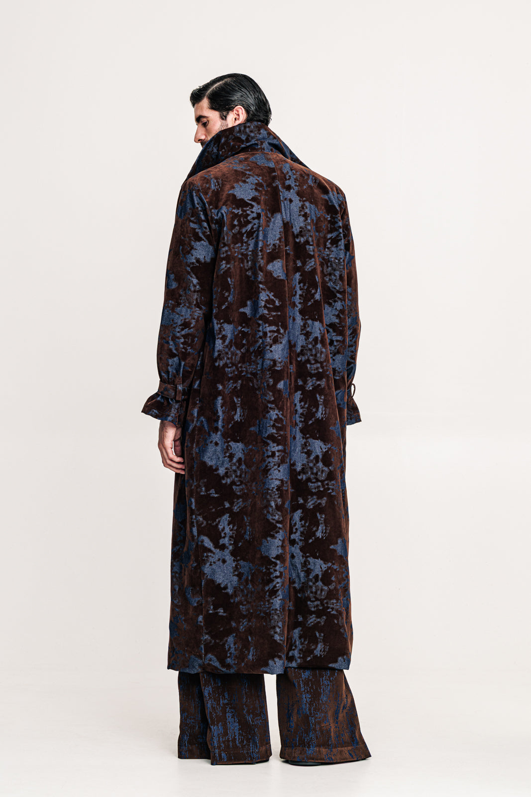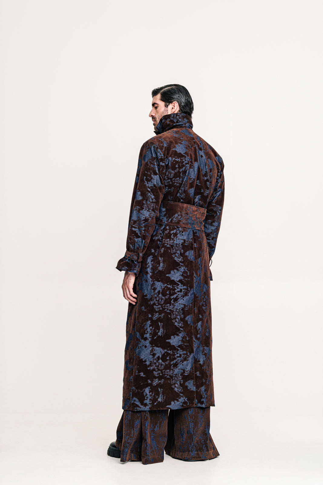 A relaxed trench coat in deep brown with a striking velvet‑textured print. Cut from cotton denim, it keeps a modern, unstructured ease while the subtle sheen adds refined depth. Minimal hardware and a flowing silhouette make it versatile from day to evening. A contemporary outerwear statement that balances bold character with understated elegance.